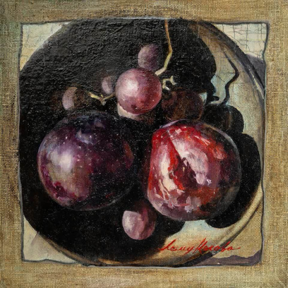 Что особенно запомнилось? Это время, когда мы на первом курсе имитировали фактуру оригинальной ткани с помощью живописных приемов. Полученные знания мне очень пригодились. На их основе я разработала несколько методик по передаче различных фактур – росписи на штукатурке, бронзы, мрамора, глины – для создания тех эффектов, которые мне необходимы для узнаваемости моего стиля. На своих полотнах я имитирую фрагменты реальных фресок и древних артефактов. Когда смотришь на мои картины вживую, изображения имеют объем и различную текстуру, которая получается за счет авторских техник.