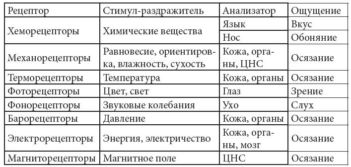 Рецепторы – это миниатюрные датчики нейронных клеток, реагирующие, на разного рода раздражение, например – свет, температуру, давление. Анализатор – это отдельный орган определенного узкого назначения с большим набором определенных (датчиков-рецепторов), например – глаз, ухо, нос. Но, помимо основной группы рецепторов клетка-нейрон содержит в себе и другие рецепторы. К примеру, язык не только реагирует на вкус посредством хеморецепторов, но и на давление, и на температуру. Следует отметить, что глаза не имеют терморецепторов и поэтому тепла или холода глаз не ощущает. Головной мозг не имеет никаких рецепторов, кроме энергорецепторов и вообще ничего не ощущает кроме энергии.