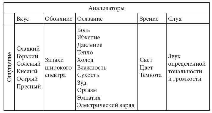 На данный момент имеется множество интерпретаций различных ощущений, но мы определим наиболее осознаваемые и составим таблицу проявления ощущений по их видам: