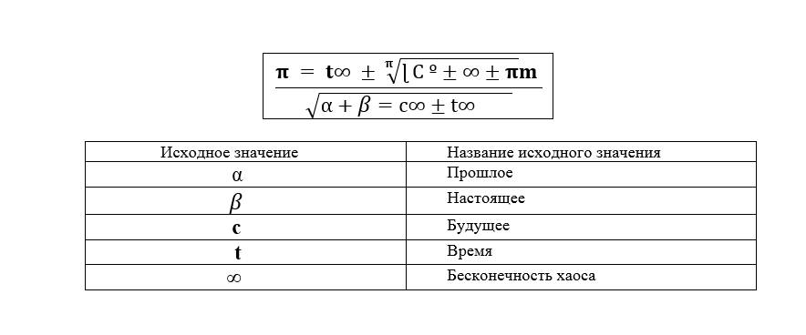 Итак, теперь в путь. В путь туда, где песок. В пустыню абсолютного времени, и его пространства. Временны́е измерения, как много их. Как много можно о них рассказать. Измерения вечного и настоящего. Грядущего и прошлого. Прошлого настоящего и будущего. Так же как прошлого, настоящего, будущего и вечного. Четыре измерения. Вы утверждаете, что измерения всего три. Это рациональность любого мозга человека, его осознание того, что с ним было, есть и будет. Но человек не задумывается, что измерений четыре, и последнее из них измерение вечного. Вечного бытия бесконечности пространства и времени. Времени, по которому мы идем после своей смерти. Вечность – вот наш удел. Вечность бесконечности времени и его хода. Время как часы, никогда не сто́ит намести. И даже если часы замедляют свой ход, а затем останавливаются, то время бежит вперед. Идет, статно шагая и не оглядываясь назад, вступает в иную эпоху, иное время, иной век. Итак, до бесконечности. Так что время и бесконечность едино как едино прошлое, настоящее, будущее бесконечности времени, его эпохального хаоса. Хаоса времен и самого́ времени. Ведь время – это хаос, а хаос – это время. Так же, как и время – это тишина и покой, гармония с самим самбой, а гармония и тишина это и есть время созидание. Созидание и одновременно хаоса. Хаоса самого́ времени. Времени верности. Времени прошлого. Времени настоящего. Времени будущего всего человечество земли и космического пространства. Пространства-времени, его бесконечности, его песков. Идущие по пескам времени, идут, не оглядываясь назад. Им нельзя оглядываться, ведь время уже ушло, и, если оглянуться и посмотреть, куда она убежала, и убежала ли вообще, мы видим позади себя лишь пустоту. Ведь прошлое – это временно́й портал между прошлом и будущем, и сделав лишь один шаг, мы пересекаем эту невидимую черту между прошлом и будущем, и попадаем в настоящее, где прошлое ушло, а будущее еще не наступило. Оглядываясь в этот момент в прошлое, мы видим лишь пустоту. Ведь прошлое уже ушло за горизонт, и вместо него образовалась пустота. Будущее еще не наступило. Оно ни так далеко, за горами. Надо сделать лишь шаг, и все повториться снова. Отсюда можно сделать вывод, что прошлое, настоящее и будущее вечного хаоса самого́ времени. То есть, α+ =c∞±t∞. Где α – это прошлое, – это настоящее, а с∞ – это будущее. ±t∞ – это время бесконечности, которое движется относительно будущего времени вперед или назад, что есть ∞ хаоса. Теперь можно представить такую формулу.