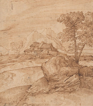 Доменико Кампаньола. Горный пейзаж со скалой, деревьями и зданиями. Италия, ок. 1520 г.