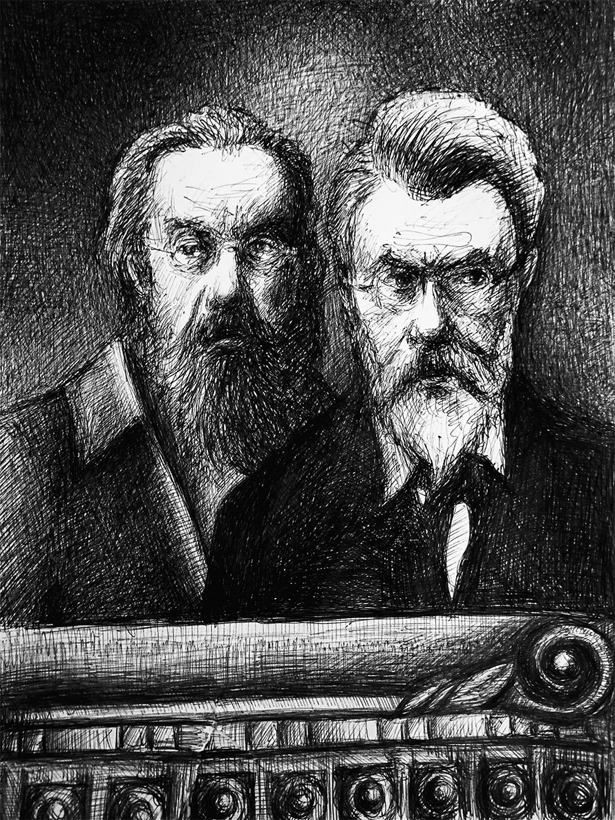 В приёмной Председателя советских профсоюзов товарища Томского витало беспокойство. Причиной тревоги и забившейся в угол секретарши являлись два подозрительных старика. Первый, суховатый и подвижный, с небольшой взъерошенной бородкой и в круглых очках, одетый в сюртук старого покроя, метался по помещению, будто ища выход не то из комнаты, не то из себя. Время от времени он резко останавливался, сотрясал поднятыми руками пространство и, запрокинув голову, восклицал: «Я абсолютно ничего не понимаю!» Второй, с окладистой бородой, в потёртом пиджаке и парусиновых брюках, сидел не шелохнувшись, уставя немигающий взгляд в белизну стены. На вопли первого он неизменно монотонно отвечал: «Я совершенно ничего не слышу».