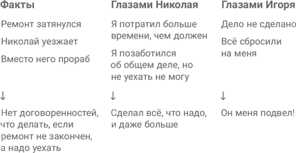 С точки зрения партнера Игоря: «Пекарня вот-вот откроется, помещение в руинах, и прораб без личного контроля не закончит ремонт вовремя. Удаленка – отстой. Николай бросил на меня свои обязанности, при этом деньги от бизнеса получим поровну. Несправедливость!»