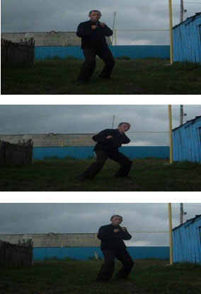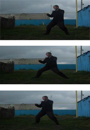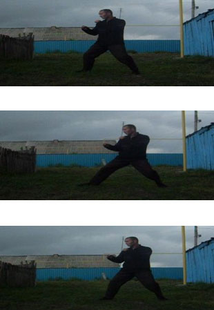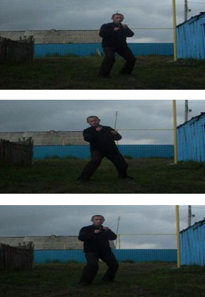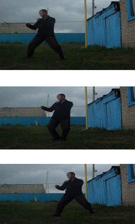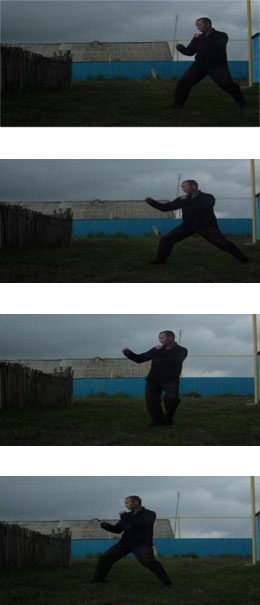 Из положения наготове сделайте скользящий шаг влево, затем продвигайте скользящим движением переднюю ногу, как только вы продвинули переднюю ногу вы должны находиться в положении наготове.