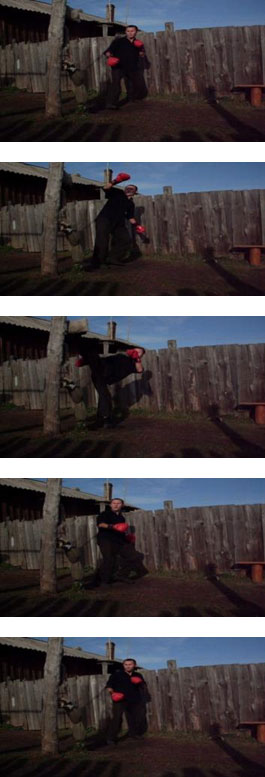 Здесь показано, как я отрабатываю быстрое движение вперед с приемами, для отработки ударов ногами на специальном манекене.