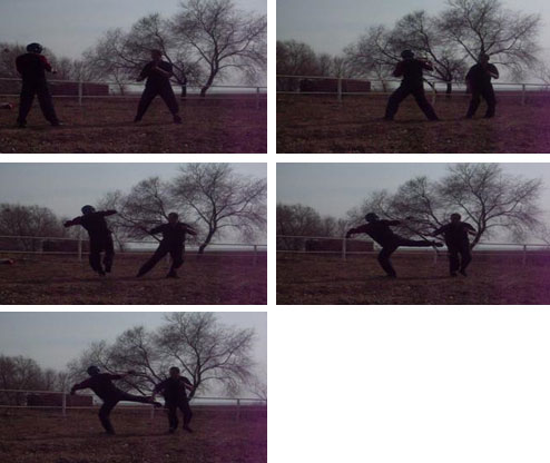 Из положения наготове я делаю шаг вперед ведущий ногой и оттолкнувшись вперед ведущей ногой, задняя нога отрывается от земли, делая прыжок, как показано на фото 3. Как только приземлившись на левой ноге, я сразу же наношу боковой удар ногой по защитному щиту, который держит партнер.