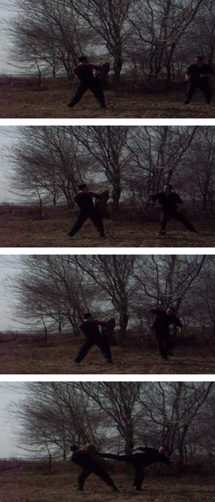 Здесь показано как я делаю быстро отход назад от бокового удара ноги партнера.