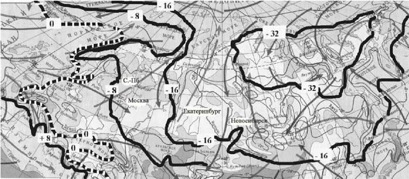 Из карты видно, что западная граница России в точности совпадает с изотермой января минус 8 °С, то есть к востоку от неё земли с длительной зимой. Азиатские же наши границы пролегают – на юге и востоке, между минус 12 и минус 16 °С. На северо-востоке расположился Полюс холода Северного полушария Земли.
