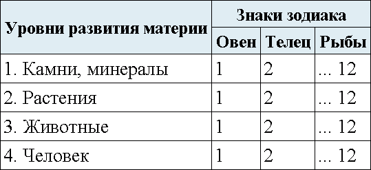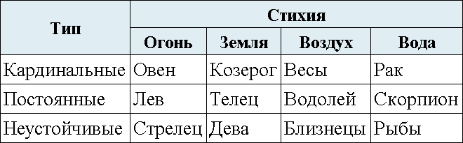 Таким образом, каждый человек имеет энергии 12 знаков, и каждый знак сочетает в себе две характеристики: один из четырех типов энергии и один из трех стилей поведения, отношения к окружающему миру. Это можно представить в виде таблицы.