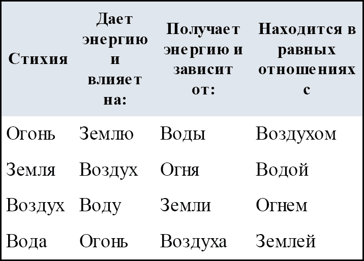 Эти традиционные названия обозначают четыре типа энергии. Огонь – это наши действия; Земля – физическая материя; Воздух – эфирная (электромагнитная); Вода – чувства и эмоции. Последовательность знаков говорит о влиянии одного типа энергии на другой. То есть под воздействием какой-либо идеи, эмоции (Огонь) человек совершает действие, создает объекты из физической материи (Земля). Материя порождает у человека ощущения (эфирная энергия, Воздух), эфир порождает чувства (Вода), которые дают начало новой эмоции и мысли, и затем цикл повторяется заново.