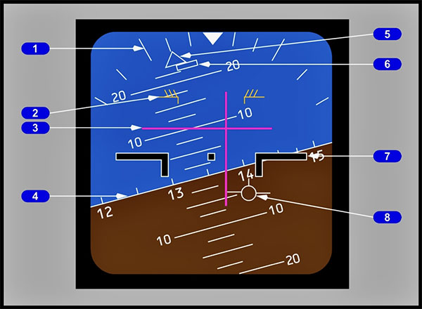 ✓ Элемент 3 – flight director (F/D). Это перекрестие показывает пилоту, куда лететь. Оно расположено на авиагоризонте, дисплей PFD.