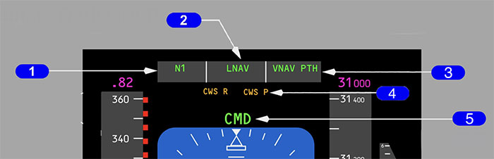 Если у вас включен режим горизонтальной навигации (например LNAV), и вы включаете другой горизонтальный режим (например HDG SEL), то первый режим отключится и подключится HDG SEL.