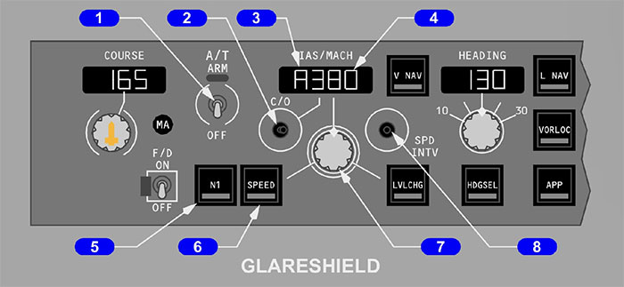 ✓ Элемент 7 – этой крутилкой задается желаемая скорость. Она будет отображаться в окошке IAS/MACH (элемент 4).