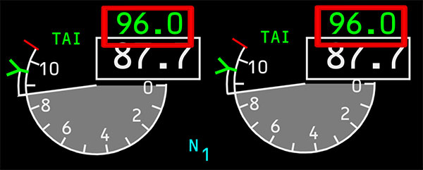 Узнать, какая тяга будет использоваться в режиме N1, можно над индикацией оборотов левого и правого двигателей на верхнем дисплее. Выделено красным прямоугольником. (см. рис. 4.3, элемент 1).