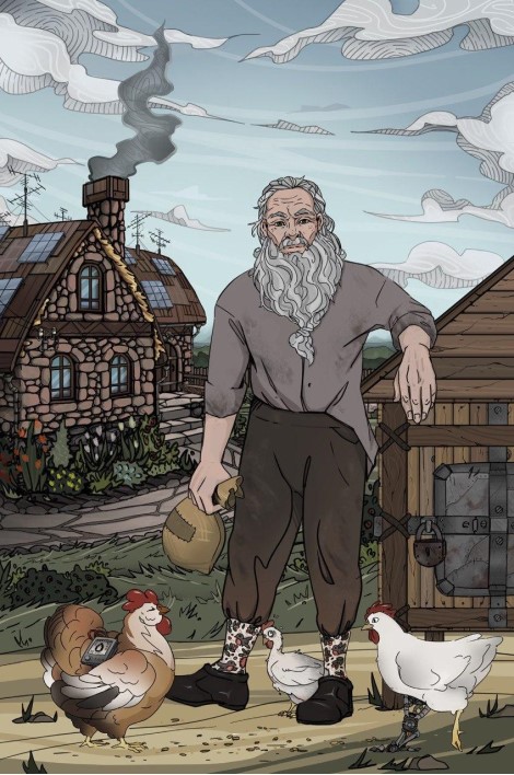 Посередине поляны был вырыт небольшой колодец, накрытый дощатой крышкой с люком для спуска ведра. Справа от колодца находился курятник с большой дверью, закрытой на внушительный металлический замок. Возле курятника стоял дед Оберон, одетый в серую рубашку, запачканную землей, длинные мешковатые штаны, заправленные в шерстяные носки и специальные резиновые ботиночки – Роби знал, что в древности их называли «галоши». Седые, до плеч, волосы деда поблескивали на солнце, а кудрявую бороду он собрал в хвостик.