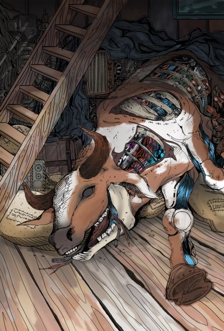 Момент, когда в их доме появился Арнольд, Роби помнил плохо – он был тогда совсем мал. Но хорошо знал эту историю от деда, который любил рассказывать, как во время очередной вылазки в лес наткнулся в развалинах на какой-то необычный механизм, похожий на те, что производят в Бест-Хард-Сити. Однако, рассмотрев машину, дед к своему удивлению обнаружил, что это обыкновенный живой петух, только с множеством механических имплантов. Оберон принес петуха домой, починил и выходил, решив, что тот может служить отменным ночным сторожем. В механической части петушиных внутренностей, между шестеренками, была вложена старая фотография мускулистого мужчины, позировавшего на камеру, а на ее обороте были слова: «Моему дорогому другу от Арнольда». Так сторожевой петух получил свое имя.