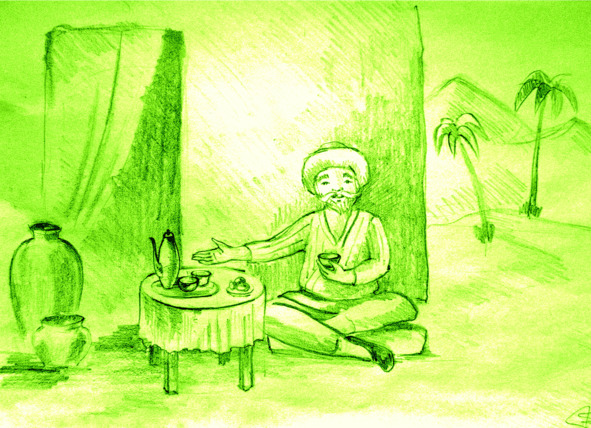 Шагали таким образом наши герои, шагали, пока впереди не показался оазис с пышными, цветущими, дающими обильную тень деревьями и арыком, наполненном прозрачной водой. В этом райском местечке располагалось заведение для отдыха путников, чайхана. Под тенистым навесом были расстелены ковры с вышитыми шёлковыми подушками и низенький столик, на котором располагались заварной чайник, расписные пиалы и ваза с фруктами.