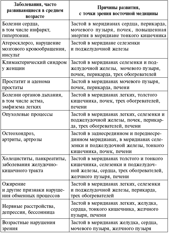 Развитие возрастных заболеваний можно замедлить и даже остановить с помощью рефлексотерапии. Давайте оценим причины возникновения возрастных болезней с точки зрения восточной медицины! В таблице, приведенной на следующей странице, каждый из нас с большой вероятностью найдет индивидуальные зоны риска: возможные наследственные заболевания или уже проявленные признаки болезни.