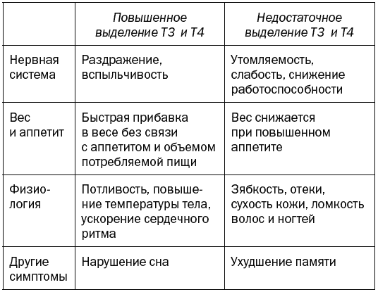 Чрезмерное или недостаточное выделение щитовидной железой гормоновТ3 (трийодтиронин) и Т4(тироксин) ведет к заболеваниям, которые редко удается вовремя идентифицировать. Симптомы заболевания щитовидной железы мало кто опознает, считая их вызванными стрессами или другими болезнями (табл. 1).