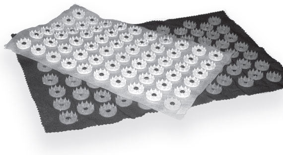 Первые ипликаторы Кузнецова представляли собой резиновый или пластмассовый коврик с впрессованными пластмассовыми или стальными иглами (П-образными скобками). Сейчас чаще всего этот незатейливый прибор продается в виде куска плотной ткани с наклеенными или нашитыми на нем пластинами с множеством иголок высотой в несколько миллиметров (рис.1). Расстояние между иголками у ипликатора может варьироваться от 2 до 8 мм. Поскольку иглы расположены очень близко друг к другу и имеют небольшую высоту, они не травмируют кожу.