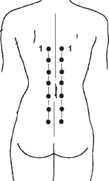 2. Если боль не унялась, надавливаем поочередно с каждой стороны позвоночного столба, начиная от точки (1) – вниз. Прорабатываем точки через каждые 5 см, опускаясь до 5-го поясничного позвонка. Каждое надавливание длится не менее 3 секунд.