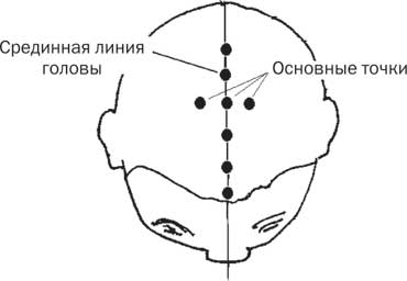 1. Надавливаем в течение 5 секунд на каждую из 6 точек заднесрединной линии, проходящей через макушку (рис. 2). Сделаем 3 прохода по указанным на рисунке точкам.