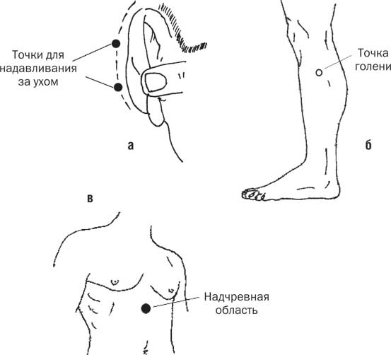 2. Если укачивание возникает при резком торможении, поворотах автомобиля, нужно остановиться, выйти на воздух и сильно надавить на сосцевидные отростки за ухом (выступающие за ухом кости, рис. 3, а) и на надчревную область (рис 3, в).