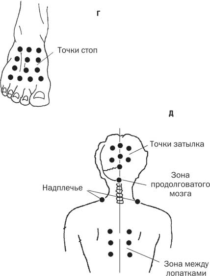 3. Причиной укачивания может быть голод, плохой сон, долгое сидение в одной позе. Чтобы помочь себе, надо надавить пальцами на особые точки на голенях (одновременно на обеих, см. рис. 3, б), затем обработать надавливанием своды стоп (в течение 5 секунд каждую точку, рис. 3, г), а также зону продолговатого мозга (рис. 3, д).