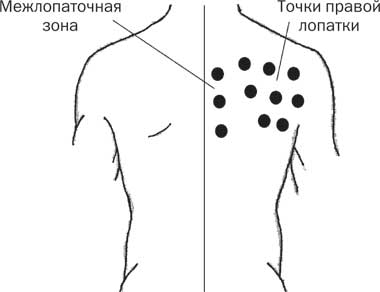 2. Затем большими пальцами по 3 секунды надавливаем на точки, расположенные вокруг лопаток (см. рис. 4) и подмышечных ямок. Это прием поможет создать здоровое напряжение в мышцах лопаточной зоны, которое поспособствует укреплению желудка и кишечника.