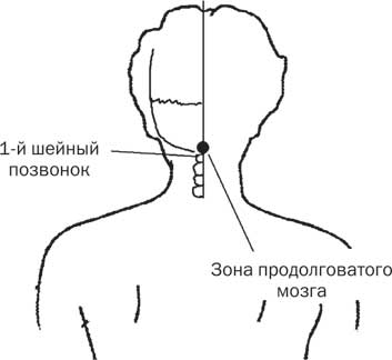1. Надавливаем совмещенными средними пальцами на заднюю поверхность шеи и на проекцию продолговатого мозга, который управляет рефлексами нервной системы. Надавливание на каждую точку 3 секунды, повторяем прием трижды.