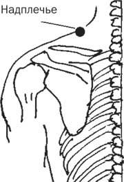 2. После хорошего разогрева можно продолжить осторожное надавливание. При шейном простреле надавливайте большим пальцем на область надплечья (рис. 10). Очень бережно, но длительно, до 20 секунд. Сделайте перерыв, потом повторите надавливание. И так до тех пор, пока не уйдет поверхностное стеснение и глубокий зажим.