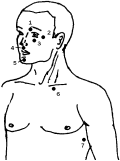 Точки 1 – на внутренних краях бровей. Уверенно барабаним по костям глазниц, с усилием, приблизительно равным печатанию на пишущей машинке (чуть более интенсивно, чем на клавиатуре компьютера).