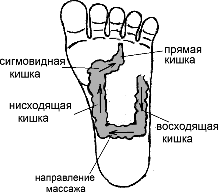 Всю зону толстого кишечника проходим массажем по часовой стрелке. Конечная точка движения расположена у основания 3 и 4-го пальцев.
