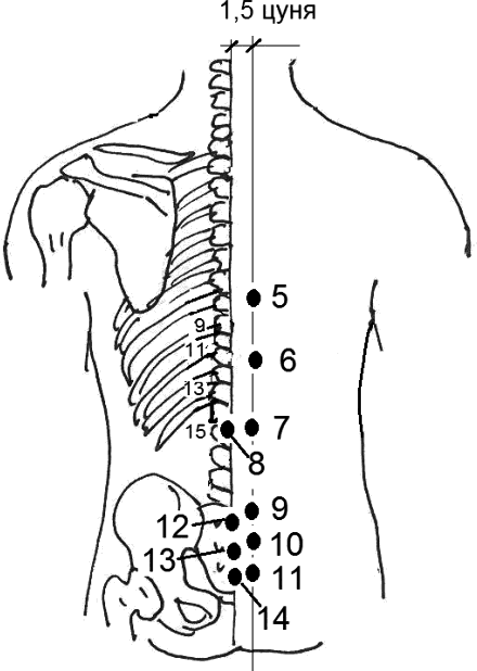 9. Гуань-юань-шу («ключ к первичной ци на спине») расположена на 1,5 цуня кнаружи от места под остистым отростком 5-го поясничного позвонка (рис. 11,б).