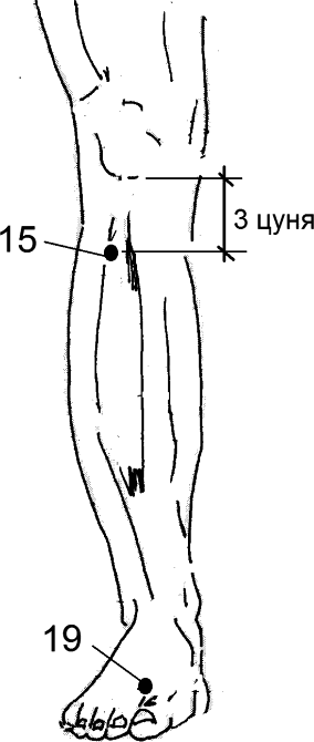 На ногах: 16. Сань-инь-цзяо, 17. Фу-лю, 18. Тай-си, 19. Тай-чун.