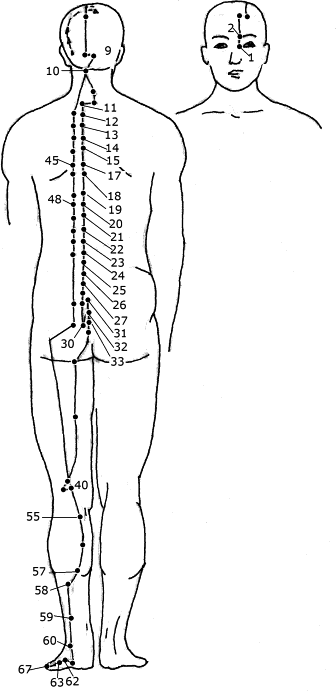 Меридиан мочевого пузыря имеет функциональные связи с мозгом, сердцем, почками. На симметричных меридианах мочевого пузыря описано по 67 точек. Мы задействуем только основные, общеупотребимые. Главные точки меридиана: возбуждающая точка – 67 Чжи-инь, успокаивающая точка – 65 Шу-гу, противоболевые точки – 63 Цзинь-мэнь и 59 Фу-ян.