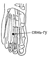 5. Указательным и средним пальцами сильно стучим по точке между основаниями 1-го и 2-го пальца ноги. Можно воздействовать одновременно на обеих стопах по 1 минуте (рис. 10, г).