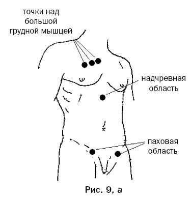 6. Теперь легко надавливаем открытой ладонью надчревную область (рис. 9, а). Выполняем толкательные движения вверх, начиная от низа живота и до пупка. Затем производим легкое надавливание ладонью на паховую область (рис. 9, а). Обратите внимание: силу применять нельзя, движение исходит даже не от плеча, а только от ладони.