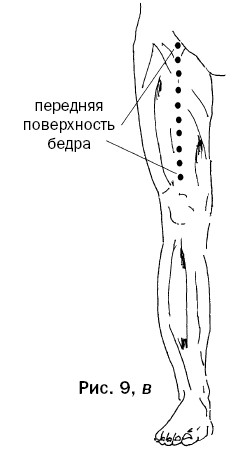 5. Простукиваем зону вокруг остистого отростка 4-го поясничного позвонка, отшлепываем открытой ладонью зону ягодиц (рис. 9, б), передние поверхности бедер (левого и правого, рис. 9, в).