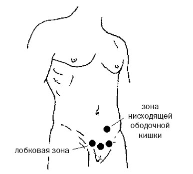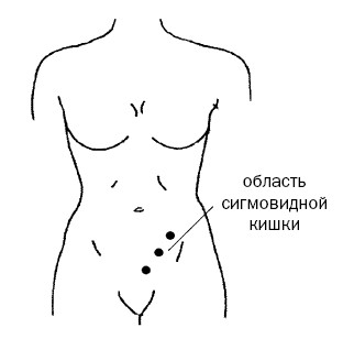 1. Тремя пальцами ритмичными вдавливающими движениями 4 пальцев обеих рук воздействуем на область сигмовидной кишки (рис. 11) в течение 3–4 минут. Это вызовет перистальтику кишечника и позыв к дефекации.