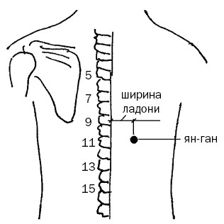 Симметричные точки Ян-ган на спине – основной объект простукивания при лечении застойных явлений в печени. Точки расположены на ладонь кнаружи от остистого отростка 10-го грудного позвонка (слева и справа, рис. 12, а). Точки можно прохлопывать ладонями одновременно в течение нескольких секунд.