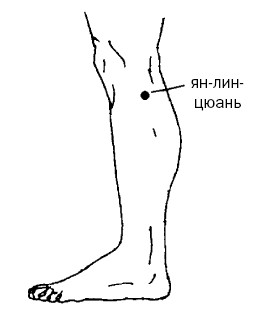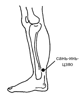 При хроническом застое в печени и желчном пузыре используйте также похлопывание точек Ян-лин-цюань и Сань-инь-цзяо (на ногах). Ян-лин-цюань («родник у холма на наружной стороне колена») расположена под коленом, на внешней стороне голени (рис. 12, б). Сань-инь-цзяо («пересечение трех каналов») расположена на ладонь выше лодыжки, у заднего края поверхности большеберцовой кости (рис. 12, в).