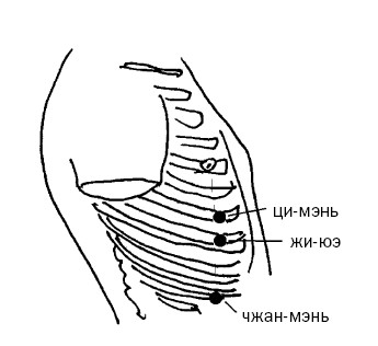 Также можно добавить к сочетанию надавливание ладонью (не простукивание!) точек Жи-юэ, Ци-мэнь, Чжан-мэнь (на груди).