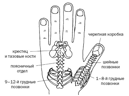 1. Техника начальной обработки (или разогрева) рефлексной зоны позвоночника и ребер на ладони или стопе предельно проста. Обхватываем массируемый большой палец другой рукой. Продольным движением вперед-назад большого пальца массирующей руки растираем всю рефлексную зону в трех проекциях (то есть по всей поверхности пальца), включая основание черепа (то есть сустав ногтевой фаланги). Затем хорошо выкручиваем и разминаем палец. И в завершение четырьмя пальцами массирующей руки растираем рефлексную зону на наружной стороне ладони.