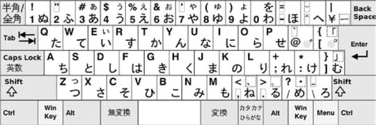 Илл. 3. Раскладка клавиш японского словопроцессора, послужившая основой для современной компьютерной клавиатуры. На большинстве сегодняшних версий знаков фонетической азбуки «хираганы» уже нет – их полностью заменяет латиница. При наборе любой фонетической комбинации во всплывающем окошечке на экране предлагается несколько вариантов иероглифов на выбор, и пишущему остаётся только подтвердить нужный знак клавишей Enter