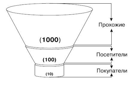 1. Во-первых, завтра же нарисуйте собственную воронку продаж со всеми четырьмя уровнями. Выберите ответственного человека, который сделает замеры по всем параметрам: сколько человек проходит мимо, сколько заходит, сколько покупает и сколько из них становится постоянными клиентами.