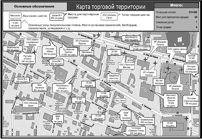 Напоследок еще один важный момент: даже если вы находитесь в торговом центре, карта все равно вам жизненно необходима. Но в этом случае помимо районной нужно сделать и карту торговой территории по схеме ТЦ, включая все этажи. В ТЦ зачастую «клиентскими магнитами» являются супермаркеты, кинотеатры, фуд-корты, а также выходы и парковки. Учитывайте это при дальнейшем размещении рекламы.
