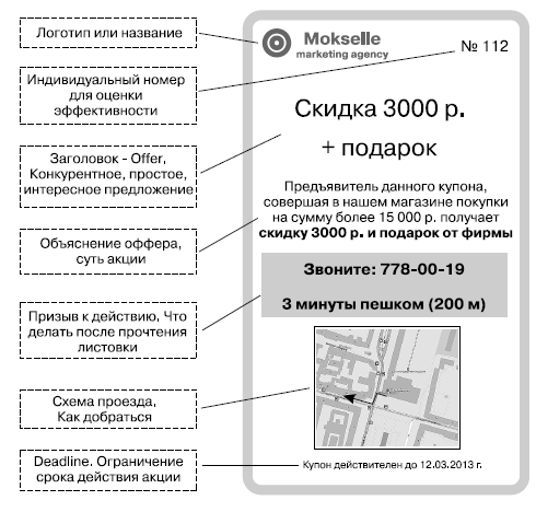 В чем заключается наш совет? Рассмотрим пример: вы проводите промоакцию посредством раздачи листовок возле ключевого узла покупательского потока (у эскалатора в торговом центре, на оживленной улице недалеко от входа в магазин и т. п.). Как обычно поступают? Разрабатывают шаблон листовки, придумывают нечто концептуальное, обязательно красивое. Пишут незамысловатый текст, что-то вроде: «Мы предлагаем такой-то товар с 2001 года. У нас есть все, приходите к нам, вы останетесь довольны». Кто-то приходит, кто-то нет. Замерить эффективность акции почти невозможно.