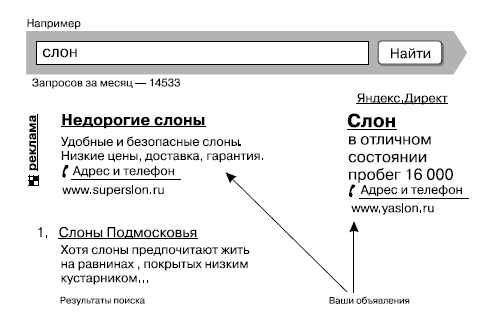Теперь рассмотрим еще одно эффективное средство продвижения – Яндекс.Директ. Это инструмент для размещения контекстных рекламных объявлений на страницах Яндекса. Служит для продвижения сайтов. Многие активно пользуются поиском Яндекс. В поисковую строку вбивают запрос – цветы, купить, дешево, оптом. Результат поиска представлен списком ссылок, отфильтрованных по релевантности. А над списком и в колонке справа от него формируются рекламные блоки. По большому счету они выглядят так же, как результаты поиска, – небольшой текстовый фрагмент и ссылка. Но на самом деле это контекстная реклама. При этом вы не платите за ее размещение на поисковых страницах Яндекс. Вы платите за конкретные клики – переходы на ваш сайт, за целевые слова, например «купить телевизор», «техника оптом», «23 февраля, подарки». Стоимость зависит от города – 2 цента за клик, 1 цент и т. д. Благодаря Яндекс. Директ ваше объявление появляется перед пользователем на выгодном месте. Оно состоит из следующих элементов: заголовка, подзаголовка, вашего телефона и ссылки на сайт.