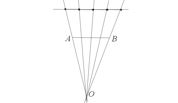 Через точку О и остальные точки проводим прямые, которые и отсекают на отрезке АВ равные части.